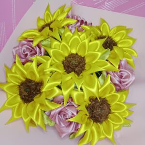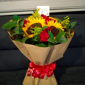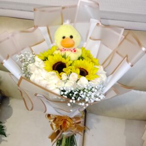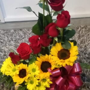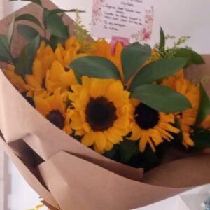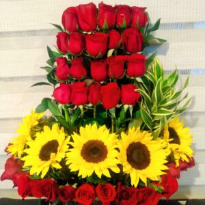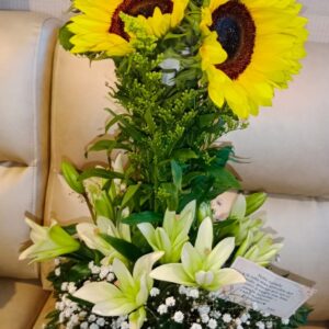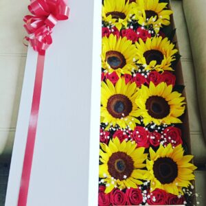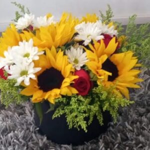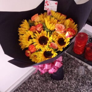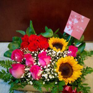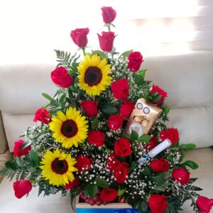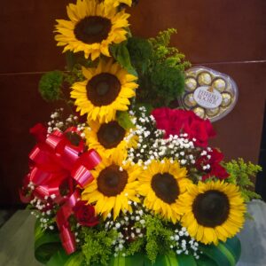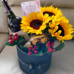 Trio de girasoles con botella de vino y ferrero corazón