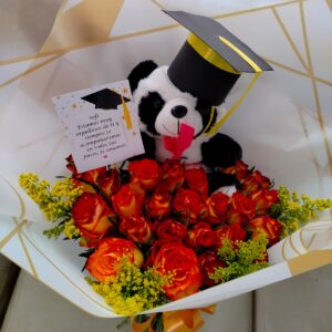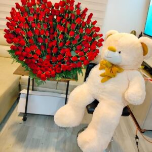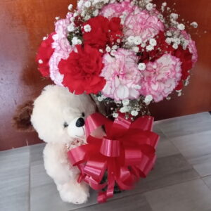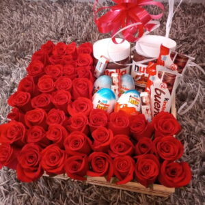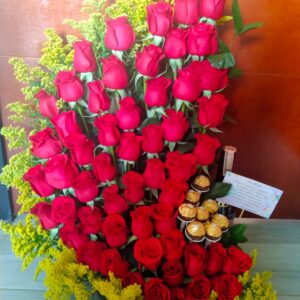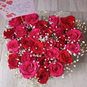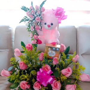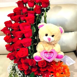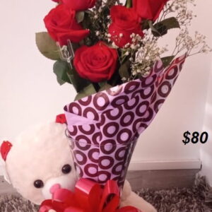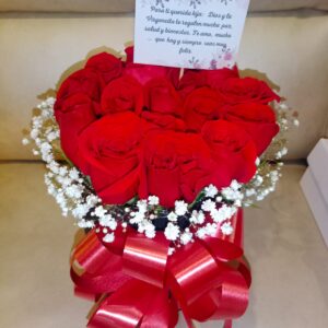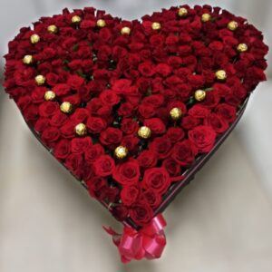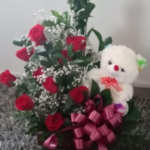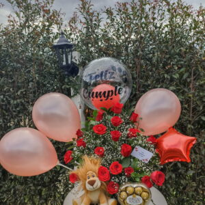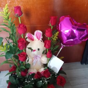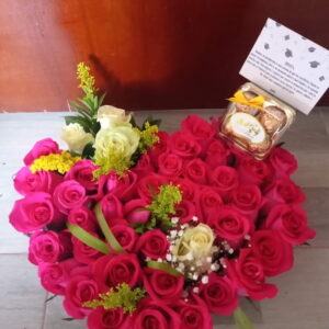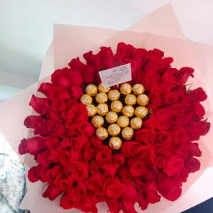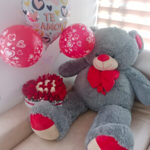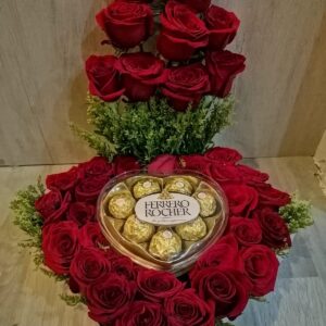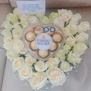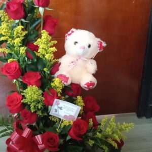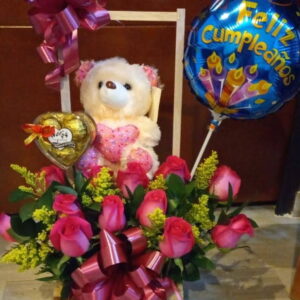 Corazon de rosas, peluche, ferrero y baileys.