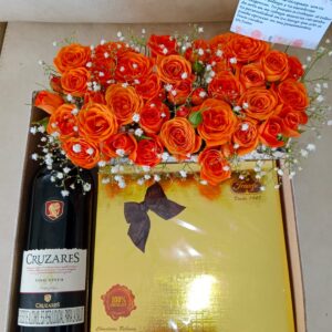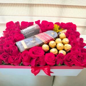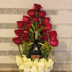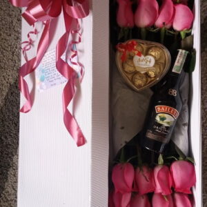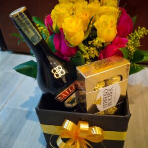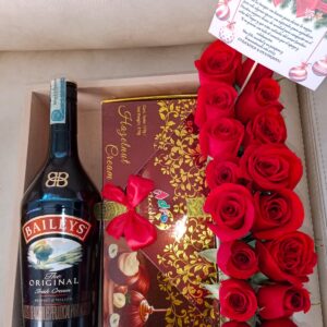 Caja por 24 rosas, media botella de baileys y chocolates