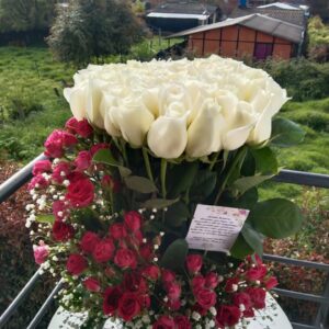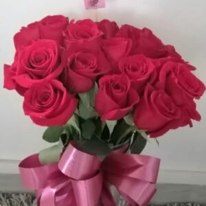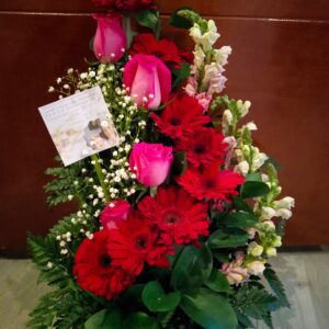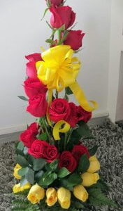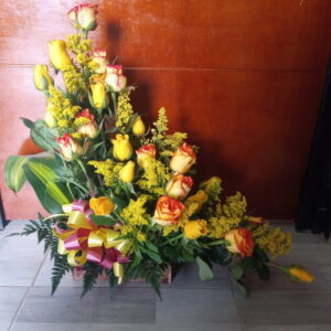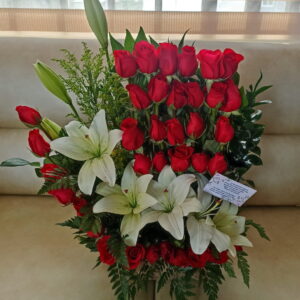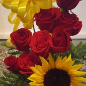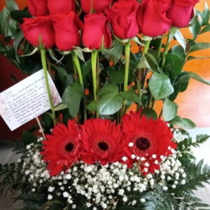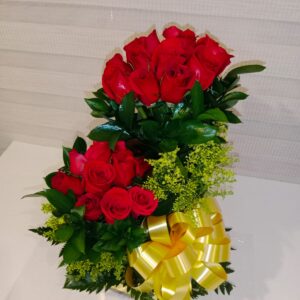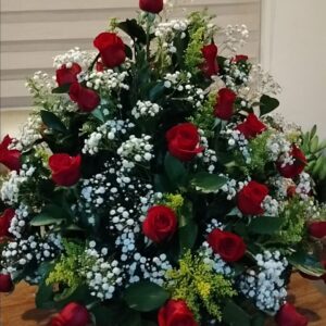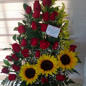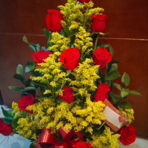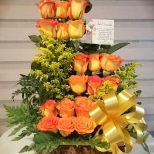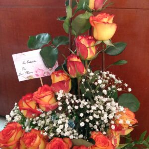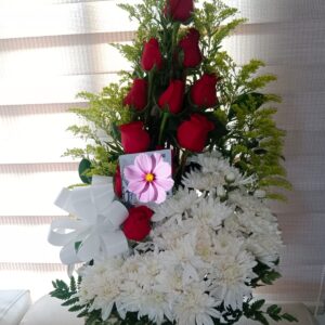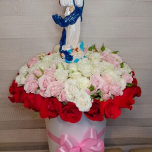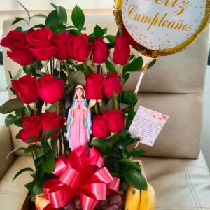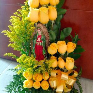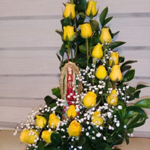 Arreglo escalera de 18 rosas con virgen