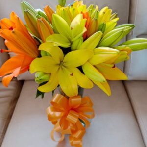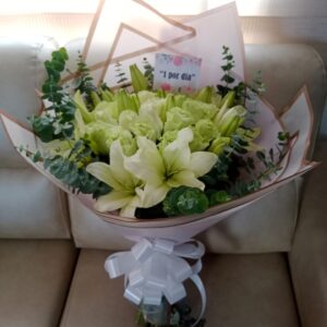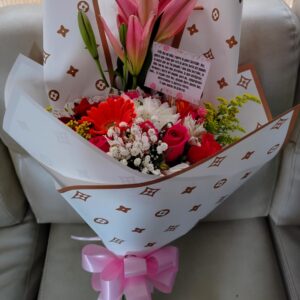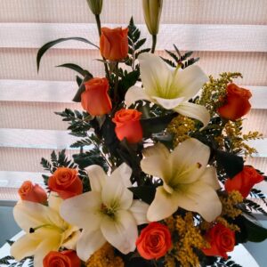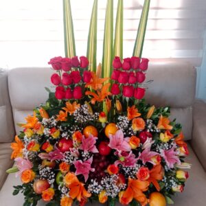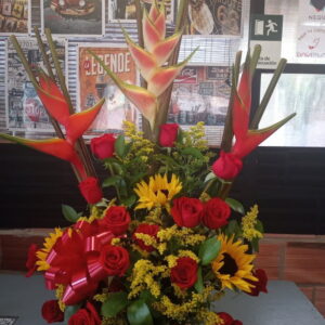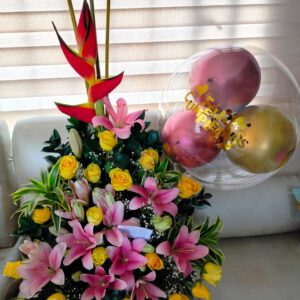 Pirámide lirios, rosas y heliconia, con globo burbuja