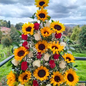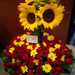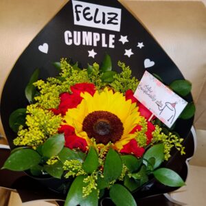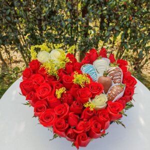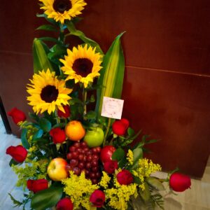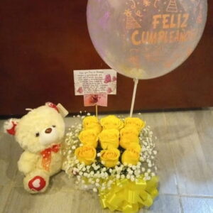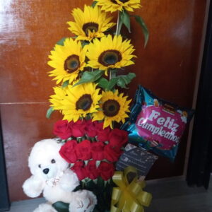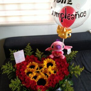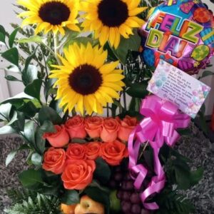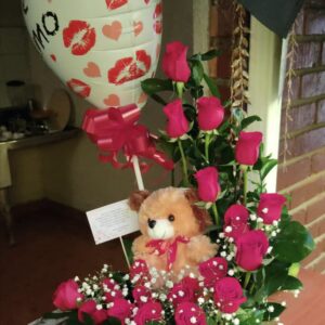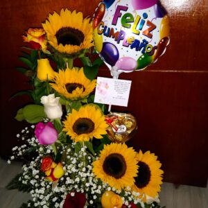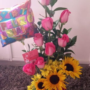 Arreglo por 18 rosas, minigirasol, 10 fresas achocolatadas y globo metalizado grande