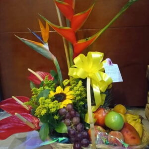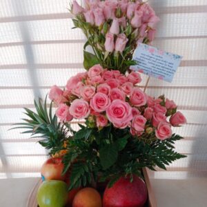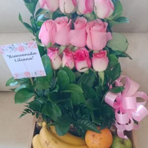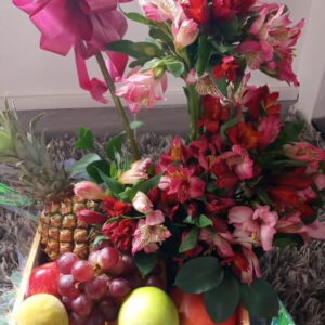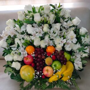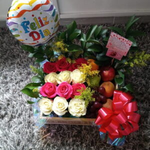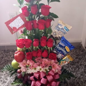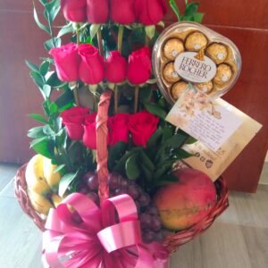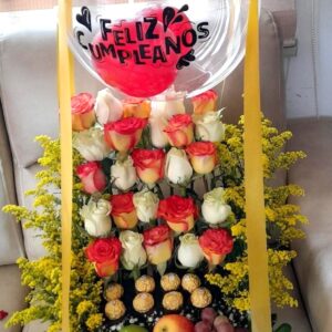 Arreglo por 25 rosas, 8 ferrero, globo burbuja y frutas