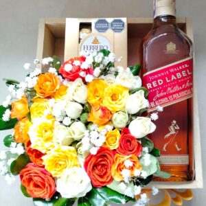 Caja de minirosas con botella de Johnny Walker y Ferrero por 4