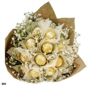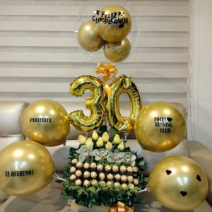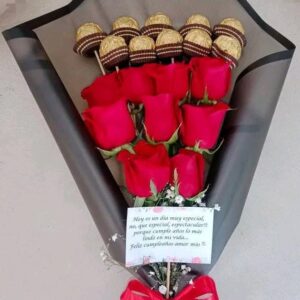 Bouquet por 24 ferrero, 12 rosas y globo metalizado