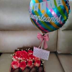 Caja por 12 rosas, 8 fresas achocolatadas y globo grande metalizado