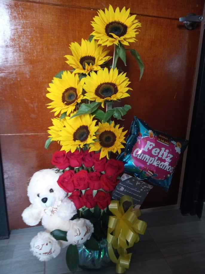 7 girasoles con 12 rosas peluche y globo