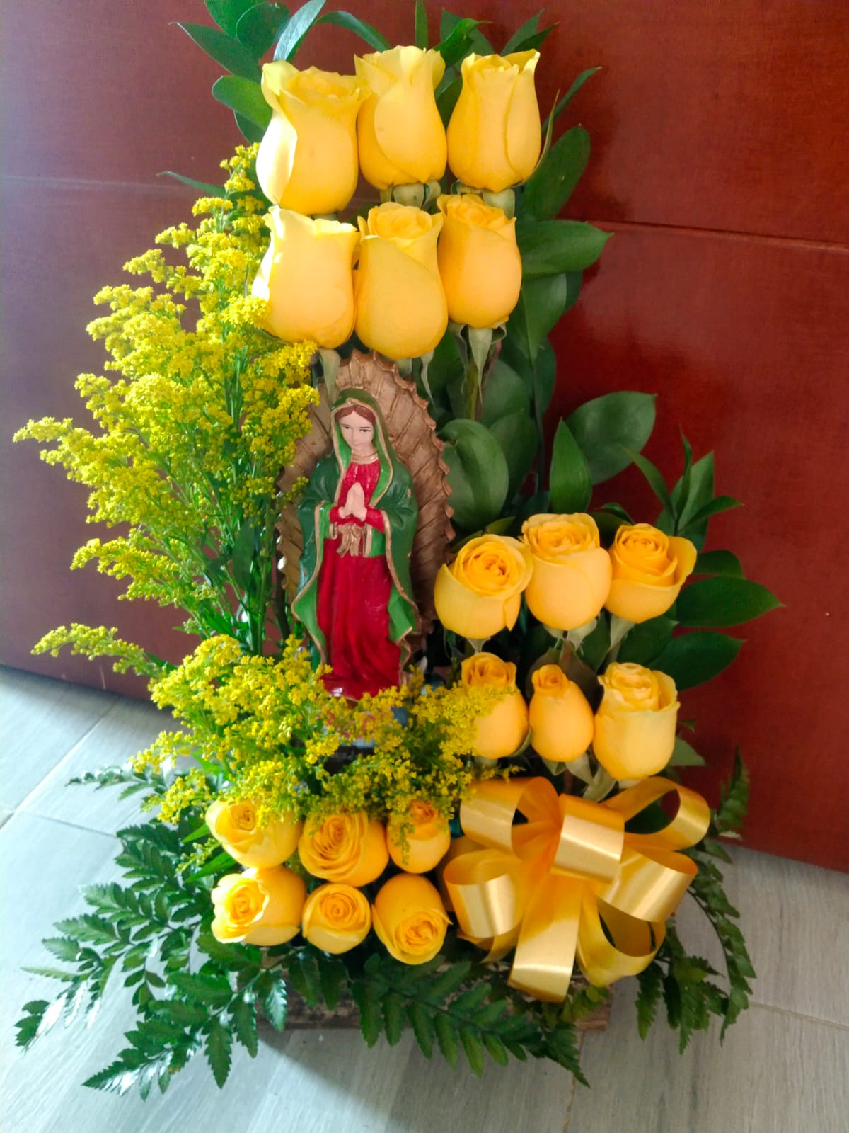 Sé el primero en valorar “Arreglo escalera de 18 rosas con virgen”