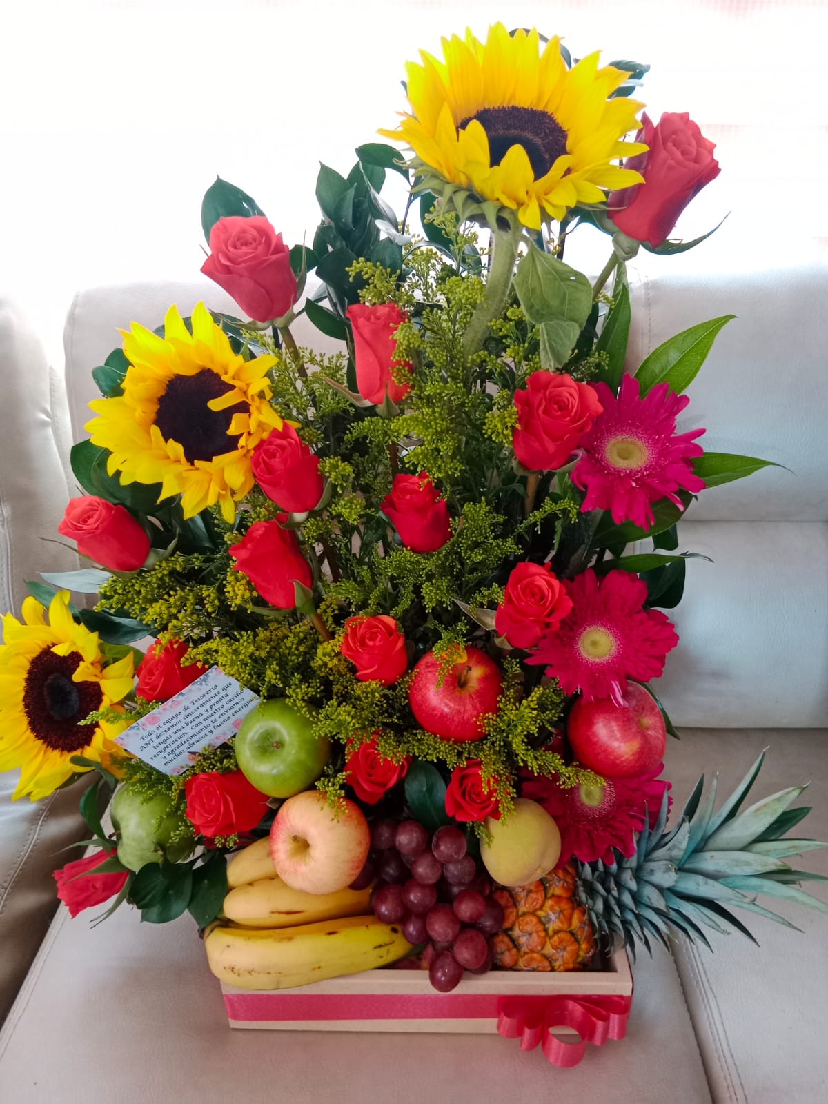 Sé el primero en valorar “Caja frutal con girasoles y rosas”